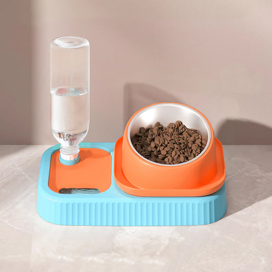 3 in 1 Dog Cat Water Bowl with Automatic Drinking Bottle Pet Food Container Drinking Dish Slow Feeder 15° Tilted Design